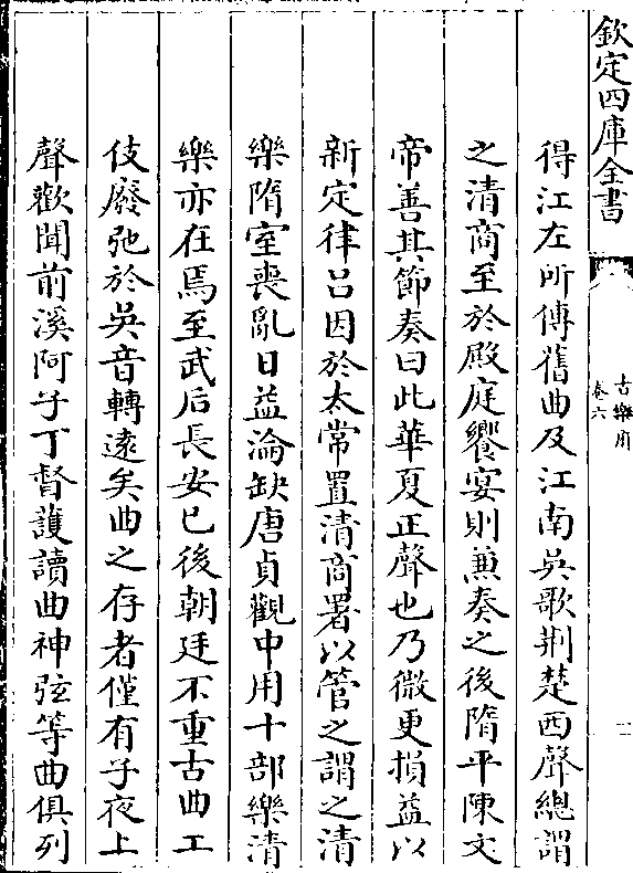 得江左所传旧曲及江南吴歌荆楚西声总谓之清商至于殿庭飨宴则兼奏之后隋平陈文