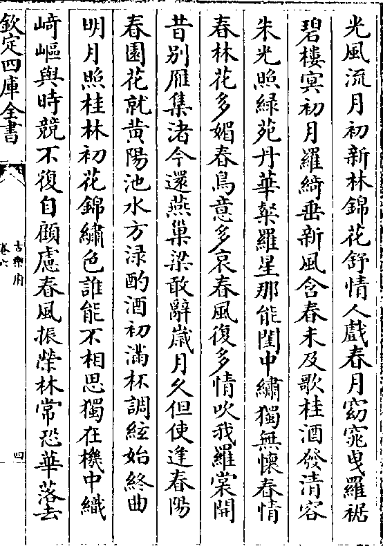 光风流月初新林锦花舒情人戏春月窈窕曳罗裾碧楼冥初月罗绮垂新风含春未及歌桂酒发清容