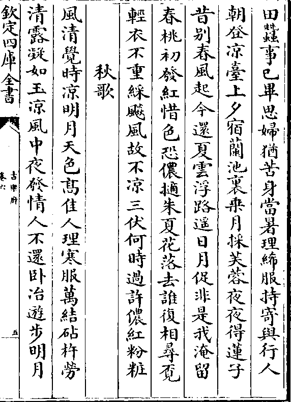 田蚕事巳毕思妇犹苦身当暑理絺服持寄与行人朝登凉台上夕宿兰池里乘月采芙蓉夜夜得莲子