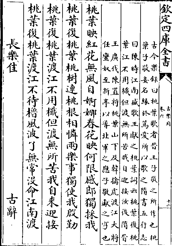 (古今乐录曰桃叶歌者晋王子敬之所作也桃/叶子敬妾名缘于笃爱所以歌之隋书五行志)(曰陈时江南盛歌王献之桃叶词云桃叶复桃/叶江不用楫但渡无所苦我自迎接汝后隋晋)