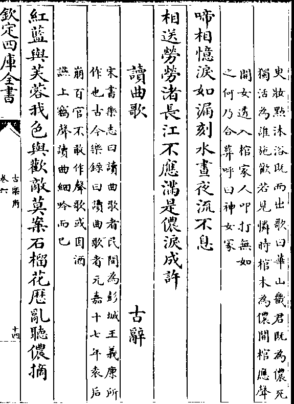 (宋书乐志曰读曲歌者民间为彭城王义康所/作也古今乐录曰读曲歌者元嘉十七年袁后)