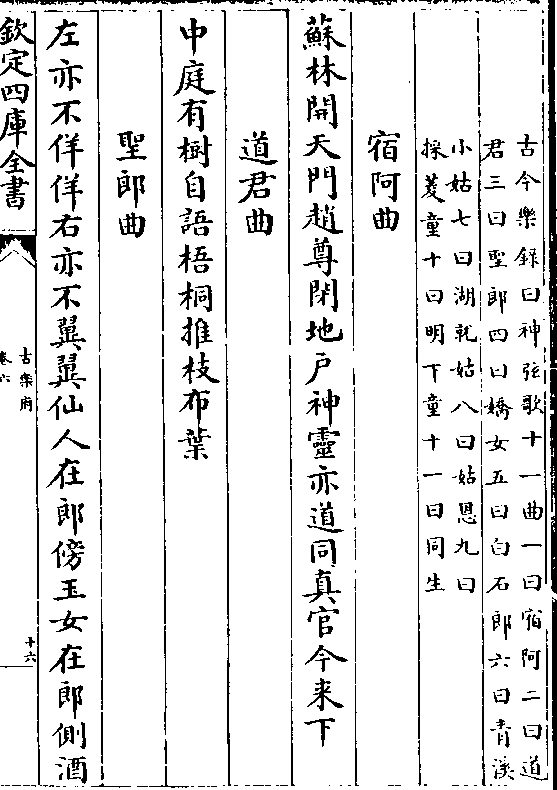 (古今乐录曰神弦歌十一曲一曰宿阿二曰道/君三曰圣郎四曰娇女五曰白石郎六曰青溪)(小姑七曰湖就姑八曰姑恩九曰/采菱童十曰明下童十一曰同生)