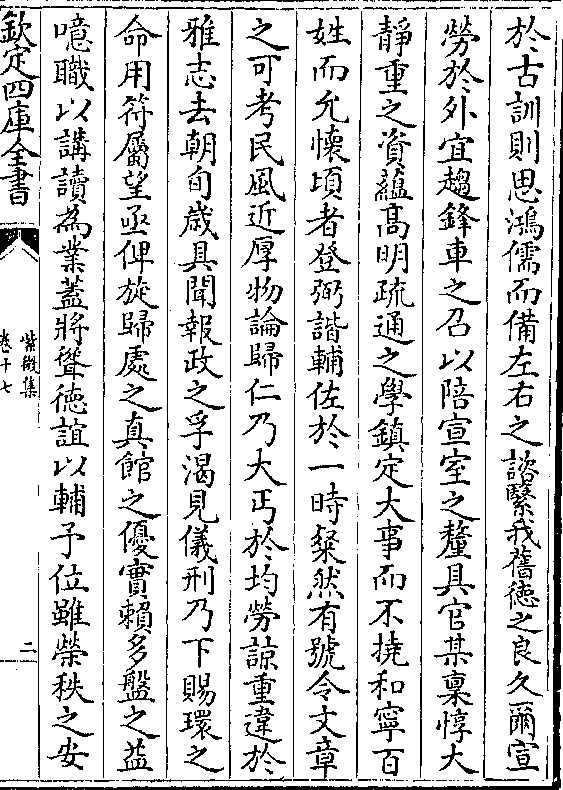 于古训则思鸿儒而备左右之咨繄我旧德之良久尔宣劳于外宜趋锋车之召以陪宣室之釐具官某禀惇大