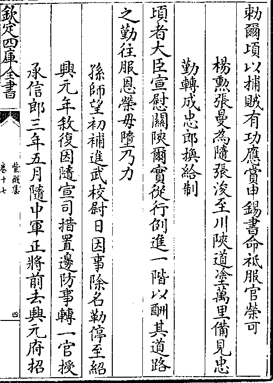 敕尔顷以捕贼有功应赏申锡书命祗服官荣可杨勋张曼为随张浚至川陜道涂万里备见忠