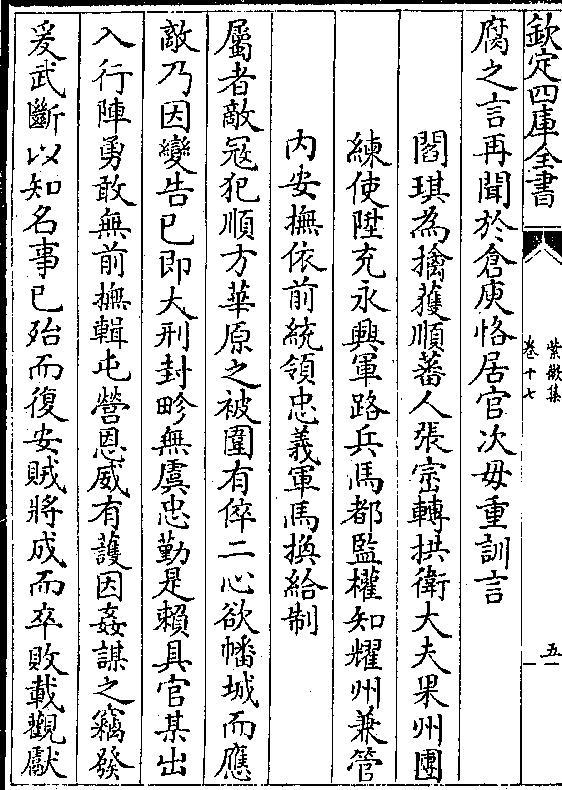 腐之言再闻于仓庾恪居官次毋重训言阎琪为擒获顺蕃人张崇转拱卫大夫果州团
