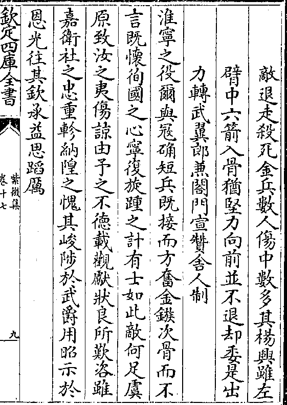 敌退走杀死金兵数人伤中数多其杨兴虽左臂中六箭入骨犹坚力向前并不退却委是出