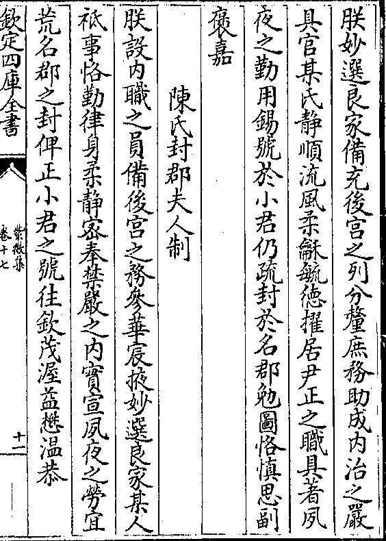 朕妙选良家备充后宫之列分釐庶务助成内治之严具官某氏静顺流风柔和毓德擢居尹正之职具著夙