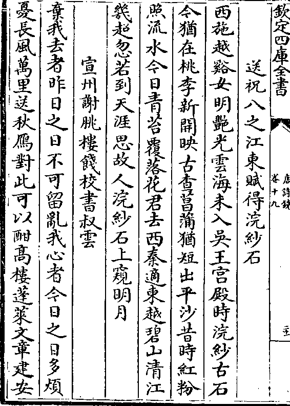 送祝八之江东赋得浣纱石西施越溪女明艳光云海未入吴王宫殿时浣纱古石