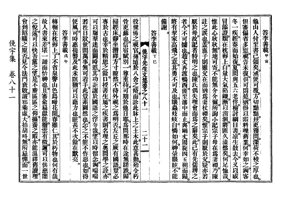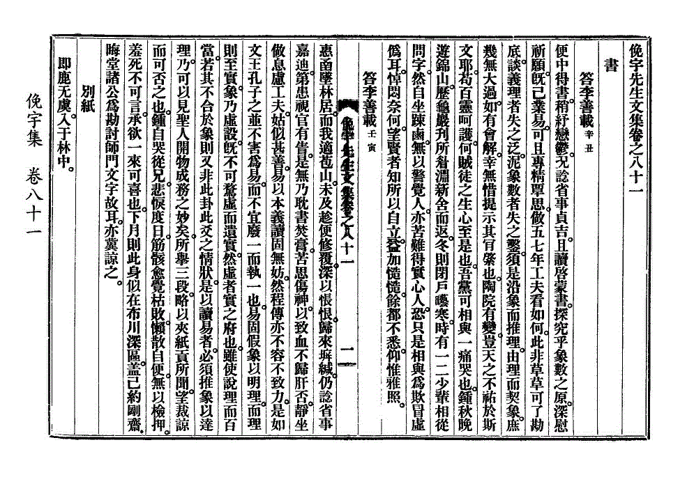 答李善载(壬寅)惠函坠林居。而我适苞山。未及趁便修覆。深以怅恨。归来𡍩缄。仍谂省事嘉迪。第患视官有眚。是无乃耽书焚膏。苦思伤神。以致血不归肝否。静坐做息虑工夫。姑似甚善。易以本义读固无妨。然程传亦不容不致力。是如文王孔子之并不害为易。而不宜废一而执一也。易固假象以明理。而理则至实。象乃虚设。既不可骛虚而遗实。然虚者实之府也。虽使说理而百当。若其不合于象则又非此卦此爻之情状。是以读易者。必须推象以达理。乃可以见圣人开物成务之妙矣。所举三段。略以夹纸贡所闻。望裁谅而可否之也。钟自哭从兄。悲悷度日。筋骸愈觉枯败。懒散自便。无以检押。羞死不可言。承欲一来可喜也。下月则此身似在布川深区。盖已约刚斋,晦堂诸公为勘讨师门文字故耳。亦冀谅之。