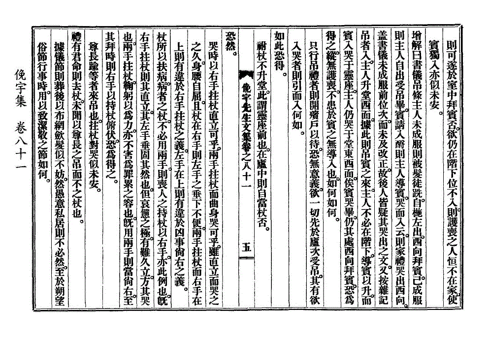 哭时以右手拄杖直立可乎。两手拄杖而曲身哭可乎。虽直立而哭之之久。身腰自屈。且杖在右手则左手之垂下不便。两手拄杖而右手在上则有违于右手拄杖之义。左手在上则有违于凶事尚右之义。