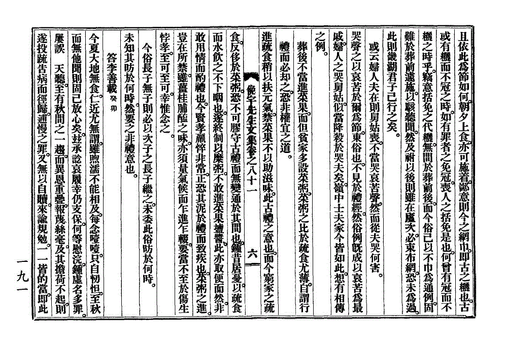 进疏食稍以扶元气。禁菜果不以助滋味。此古礼之意也。而今穷家之疏食。反侈于菜粥。恐不可胶守古礼而无变通于其间也。钟昔居忧。以疏食而水饮之不下咽也。遂终制以糜粥。不敢进菜果盐酱。此亦取便而然。非敢用情而酌礼也。今贤孝羸悴非常。正恐其泥于礼而致疾也。菜粥之进。岂在所禁。虽姜桂脯醢之味。亦须量气候而乍进乍辍。要当不至于伤生悖孝。至可至可。幸惟念之。