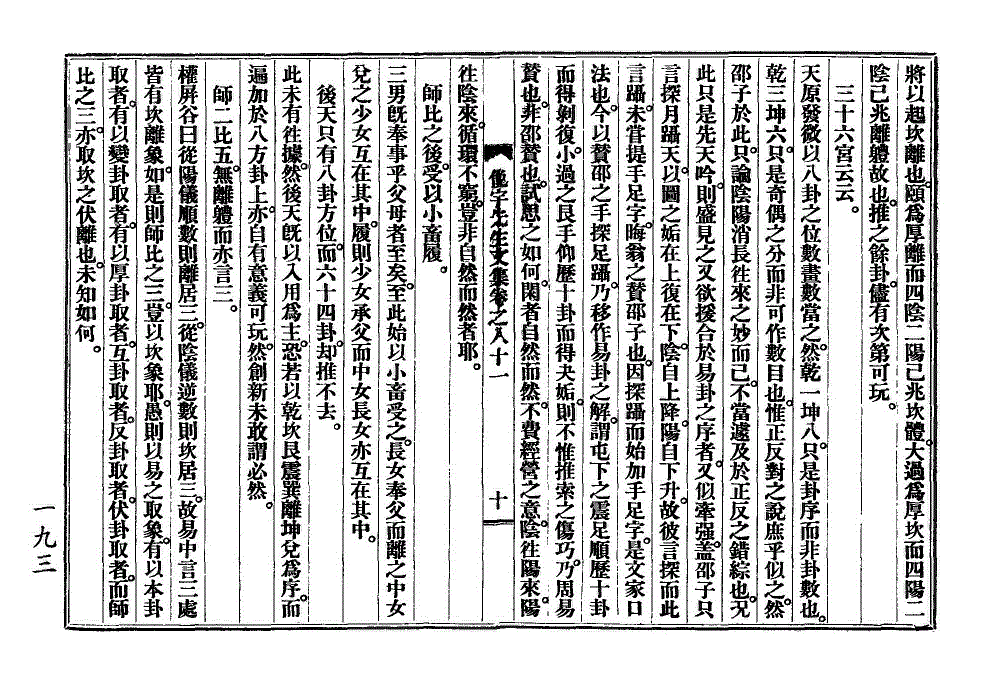 而推其馀。不暇于一一张皇也。盖易之义。以阳为尊。易之道。以中为贵。故父母既立而三男以次而诞生矣。男既备列。而又必以中男奉干父母之事。然而阳不可专用。而必资于阴。乾父之位。右长女而左少女。以启万姓生育之基。故小畜履次之。而离之中女已具于两卦互体之中矣。于是乎三男三女。俱已第列。而皆有为人父母之道矣。遂以乾坤之交不交者序其次。以见男女之交感而为夫妇。定位于外内而为父母也。天地之化。水火最为功用。而乾坤之次坎体六卦。已悉天一地六生成之机矣。泰否之次离体二卦。以奉乾体而见地二之成火。寔原于天七之生也。于是中男之贵三女之粲。所以事父者略已备矣。男之于母。亦有裕蛊之道。坤母之位。右少男而左长男。故谦豫次之。而坎之中男亦具于两卦互体之中。男女之事乎父母者略已备矣。父母之于男女。育之教之。而必为之有其室家矣。随者嫁娶之始也。男壮女少。嫁娶之常。故少女而配长男者次之。以长女而配少男者。亦事势之必有。故蛊次之。而厚坎厚离互体之中。男女相配。亦已具于随蛊之中矣。于是乎少妇承姑而临次之。冢妇代姑而观次之。礼之正也。于是亦有长男而娶中女者。中女而嫁少男者。不一其第序。故噬嗑贲次之。少男为母钟爱。而长男实养其母。故剥复次之。长男实为父后而少男恒膝于父前。故无妄大畜次之。于是乎以长男少男冢妇少妇之颐大过。总承以上诸卦之义。而颐为厚离之中女。大过为厚坎之中男。阳含阴阴抱阳。而有相交之义。故继之以坎离而终焉。此上经之序大槩如此。下经亦可例推。玆不尽释。然臆测而强为之说。岂能中理耶。坤之西南东北。既未济之东邻西邻。皆分明是先天之象。而岂蹇解必取于后天也。传义之云。寻常不能无疑也。窃意先天圆图。蹇在西北之艮宫。解在正西之坎宫。艮宫之坎。退于西南之巽则为水风之井而蹇难者勿幕矣。进于东北之震则为水雷之屯而蹇难者益屯难矣。蹇之利西南而
