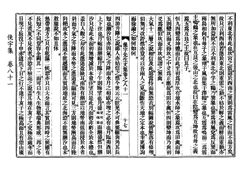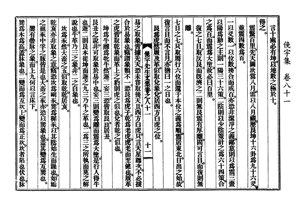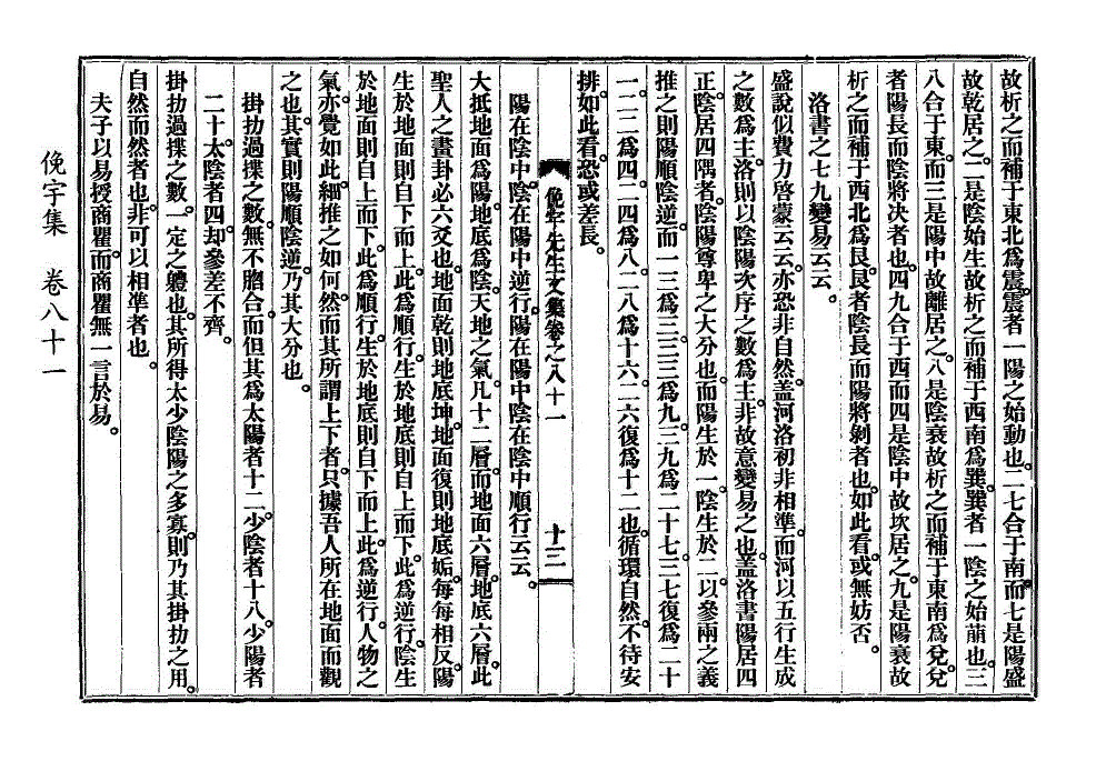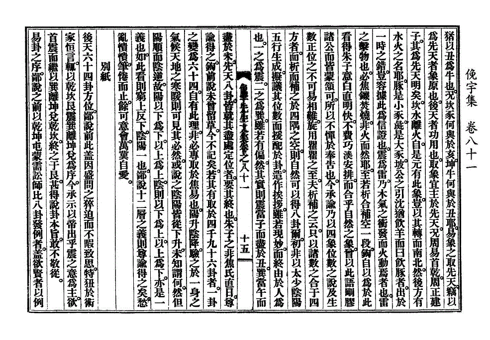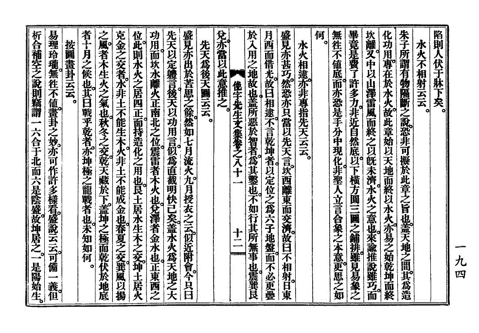 猪以丑为牛也。况坎豕何与于亥。坤牛何与于丑耶。易象之取先天。窃以为先天者象原也。后天者功用也。取象宜主于先天。况周易首乾。周正建子。其为先天明矣。坎水离火。自是元有此象。岂以其转而南北。然后方有水火之名耶。豚是小豕。彘是大豕。坡公之引沈犹饮羊而曰饮豚者。出于一时之错。岂容据此为信證也。震为雷。乃木气之冲发而火动焉者也。雷之击物也。必焦铄焚烧。非火而然耶。至若析合补空一段。鋾自以为于此看得朱子意白直明快。不费巧凑安排。而合乎自然之象。曾以此语刚胶诸公而皆蒙颔可。所以不惮于奉告也。今承谕乃以四象位数之说及生数正位之不可易相难。旋用瞿瞿之至。夫析补之云。只以诸数之合于四方者。而析而补之于四隅之空。则自然可以得八卦尔。初非以太少阴阳五行生成。拟议其位数而援配于卦。造作挨拶。虽若现妙。而终由于人为也。一之为震。二之为巽。虽若有偏。然其实则震当子而尽于丑。巽当午而尽于未。先天八卦。皆就其尽处定位者。要其终也。朱子之非焦氏直日。尊谕得之。鋾前说未曾留草。今不记矣。若其有取于四千九十六卦者。一卦之变为六十四。自有此理。非必专取于焦易也。阳升阴降。验之于一身之气候天地之寒暖则可见其必然。或说之阴阳皆从下升。未知谓何。然但阳顺而阴逆。故阳以下为下。以上为上。阴则以下为上。以上为下。亦是一义也。如此看则穷上反下。阴阳一也。鄙说十二层之义则尊谕得之矣。愁乱愦愦。笔倦而止。馀可意会。万冀自爱。别纸