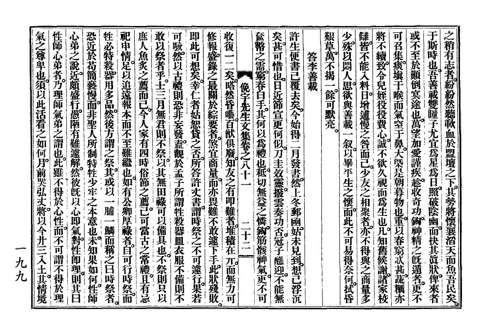 之稍有志者。纷纷然听歃血于盟坛之下。其势将怀襄滔天而鱼吾民矣。于斯时也。吾善载双瞳子尤宜为星为日。照破阴幽。而抉其真状。俾来者或不至于颠倒冥途也。万望加爱谨疾。趁收奇功。鋾神精之既遁者。更不可召集。痰填于喉而气窒于鼻。大槩是朝暮物也。重以春穷忒甚。蔬粝亦将不续。致令儿侄役役费心。诚不欲久视而为生也。凡知旧候谢。诸家校雠。皆不能入料。日增逋慢之咎而已。少友之相聚者。亦不得与之商量多少。殊以闷人。思欲与善载一叙。以毕平生之怀。而此不可易得奈何。拭昏艰草。万不揭一。馀可默亮。答李善载