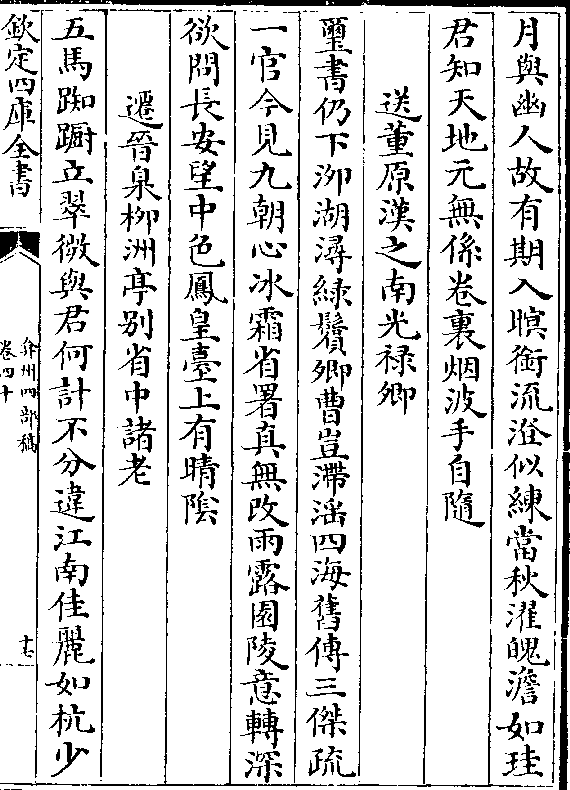 (可以望馀/杭城中)镜中湖曲棹穿花千岩半出分秋雨一径微明逗晚霞最是夜归幽绝处疏林灯火傍渔家