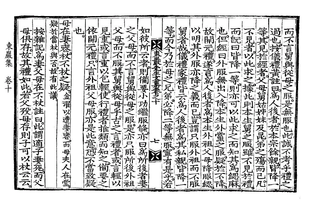 而不言舅与从母之服。是无服也。此诚不考乎礼之过也。按仪礼黄注曰。为人后者。于本宗馀亲。皆降一等。其见于经者。父母舅姑姊妹及昆弟之殇而已。凡不见者。以此求之。据此则本生舅之服。虽不见于礼。而既曰皆降一等。则亦可以此求之而知其为缌麻也。但经曰外服无出入降。本生外党之服。疑于不降。故开元礼。遂言为人后者为本生外祖父母降服缌。以明其外服亦降之义而已。岂谓只服外祖而不服舅者哉。仪礼家礼皆云为人后者为其私亲皆降一等。而今乃于母之兄弟。必降二等无服。宁有是乎。若如彼所云者。则备要小功继服条。亦曰为所后者妻之父母。而不言舅与从母之服。是亦只服所后外祖父母。而不服其舅与从母乎。古之言礼者。或言轻以见重。或言重以包轻。使行礼者推类而知之。备要之依开元礼。只言外祖父母服。亦是此意。恐不当致疑也。母在妻丧。杖不杖之疑。(金濯以遭妻丧。而母夫人在堂。疑于当杖与否。故有此议。)