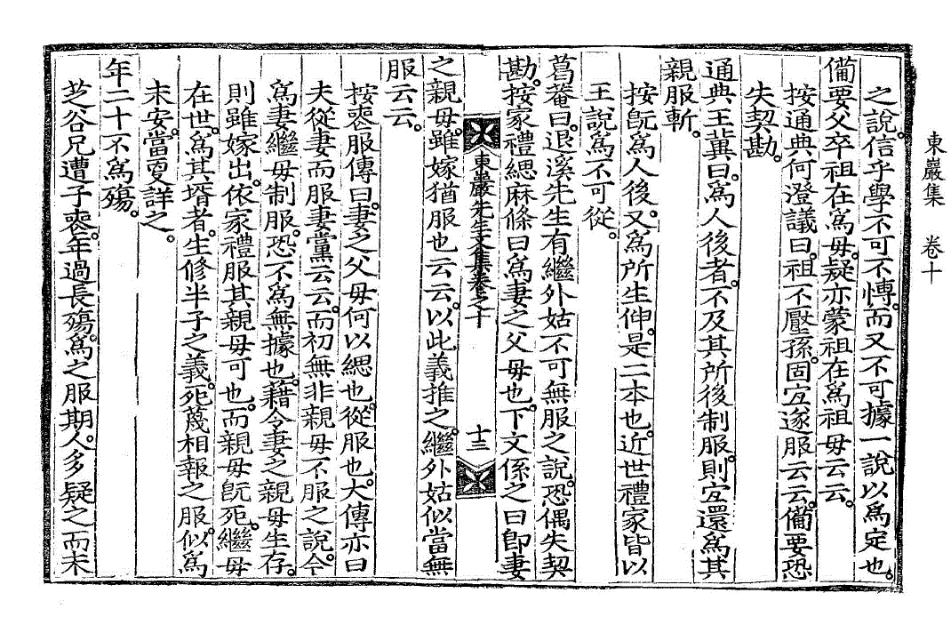 徐邈曰。今见有诸孙而祖无后。甚非礼意。礼宗子在外则庶子摄祭。可依此使一孙摄主。摄主则本服期。若周既除。当以素服临祭。依心丧以终三年。宋江氏问甲儿先亡。甲后亡。甲适孙传重。未及中祥。适孙又亡。有次孙。今当应服三年否。何承天曰。甲既有孙。不得无服三年者。但次孙先已制齐衰。今不得便易服。当须中祥。乃服练居垩室耳。范宣云大儿无子。小儿之子应服三年。亦粗可依。裴松之曰。次孙本无三年之道。无缘忽于中祥重制。如应为后者。次孙宜为丧主。终竟三年。而不得服三年之服也。司马操曰。有孙见存。岂可遂无持重者。次孙岂不得服三年邪。庾蔚之谓适孙亡。无为后者。次子之子。居然为持重。范宣议是也云云。近世南溪朴氏遂据何范之议。以为长孙之弟。当服祖父重三年。待异日立嫡孙。告祠改正。明斋尹氏亦以为承重孙无后而夭。遭祖母丧。有叔父。又有一弟。则其弟当承重主丧奉祀。他日立后。改题归宗。二说俱有所据。遵用恐或无妨。然以一时摄祀之故。而遽然服重。似为未安。又恐有后日难处之端。今依徐裴之议。摄祀孙周除之后。仍持心丧。以布直领缁笠缁带。奉馈奠以终三年。恐为允当。东岩先生文集卷之十 第 359L 页