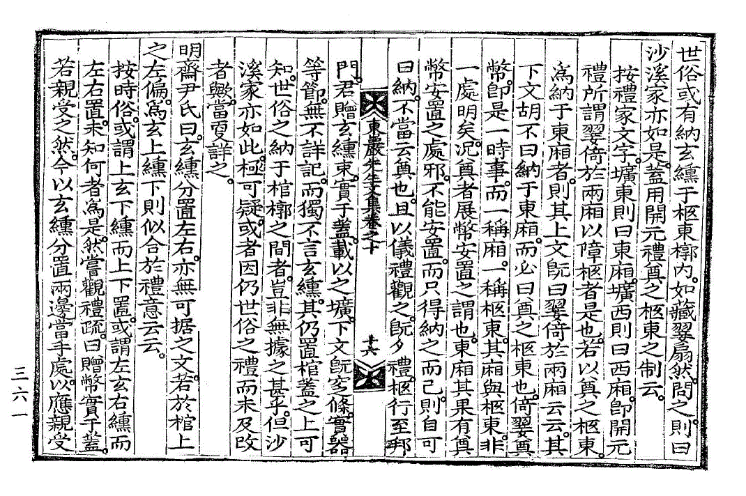 世俗或有纳玄纁于柩东椁内。如藏翣扇然。问之。则曰沙溪家亦如是。盖用开元礼奠之柩东之制云。按礼家文字。圹东则曰东厢。圹西则曰西厢。即开元礼所谓翣倚于两厢以障柩者是也。若以奠之柩东。为纳于东厢者。则其上文既曰翣倚于两厢云云。其下文胡不曰纳于东厢。而必曰奠之柩东也。倚翣奠币。即是一时事。而一称厢。一称柩东。其厢与柩东。非一处明矣。况奠者展币安置之谓也。东厢其果有奠币安置之处邪。不能安置。而只得纳之而已。则自可曰纳。不当云奠也。且以仪礼观之。既夕礼。柩行至邦门。君赠玄纁束。实于盖。载以之圹。下文既窆条。实器等节。无不详记。而独不言玄纁。其仍置棺盖之上可知。世俗之纳于棺椁之间者。岂非无据之甚乎。但沙溪家亦如此。极可疑。或者因仍世俗之礼而未及改者欤。当更详之。