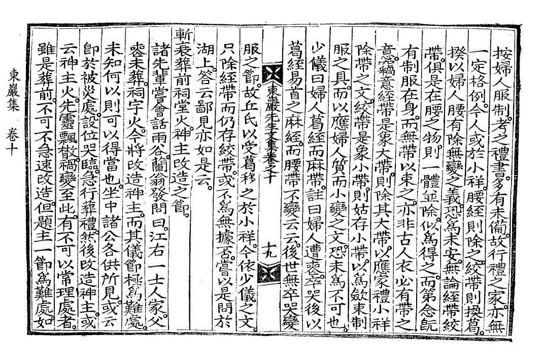 按妇人服制。考之礼书。多有未备。故行礼之家。亦无一定格例。今人或于小祥。腰绖则除之。绞带则换葛。揆以妇人腰有除无变之义。恐为未安。无论绖带绞带。俱是在腰之物。则一体并除。似为得之。而第念既有制服在身。而无带以束之。亦非古人衣必有带之意。窃意绖带是象大带。则除其大带。以应家礼小祥除带之文。绞带是象小带。则姑存小带。以为敛束制服之具。而以应妇人质而小变之文。恐未为不可也。少仪曰妇人葛绖而麻带。注曰妇人遭丧。卒哭后以葛绖易首之麻绖。而腰带不变云云。后世无卒哭变服之节。故丘氏以受葛移之于小祥。今依少仪之文。只除绖带而仍存绞带。或不为无据否。尝以是问于湖上。答云鄙见亦如是云。斩衰葬前祠堂火。神主改造之节。