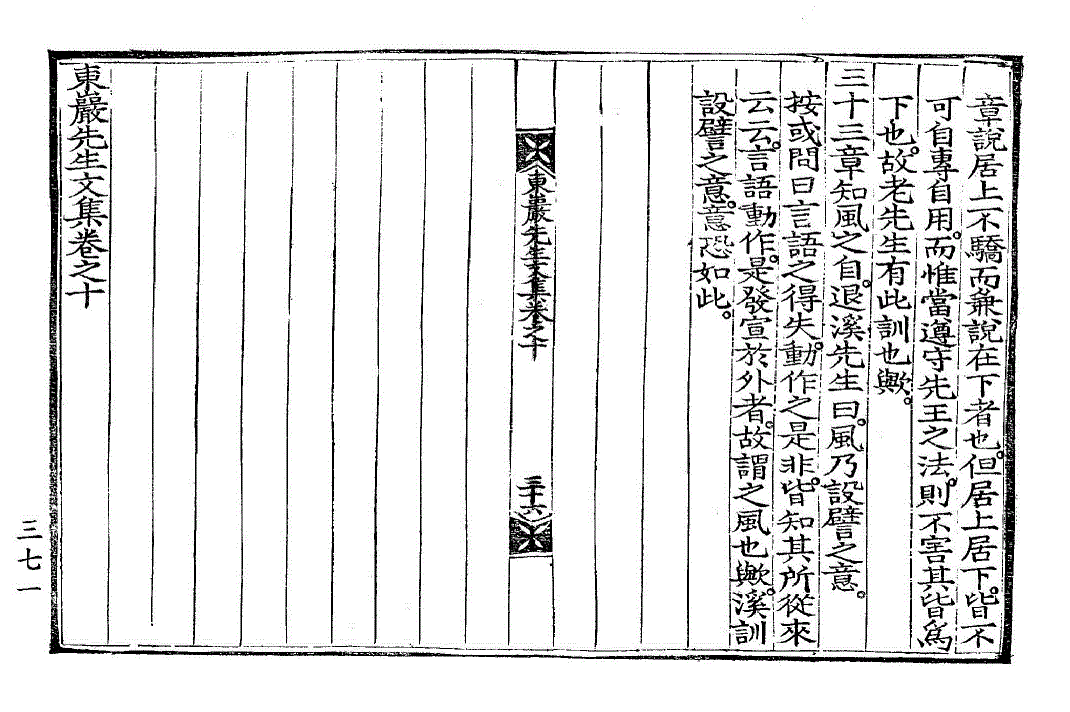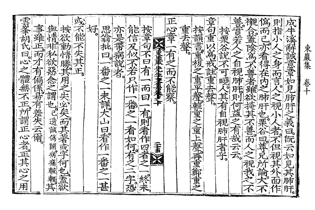 思翁批曰得之。 后更思之。注文初不言审其心之所发。而乃曰密察此心之存否。则是乃直指心之主宰而言耳。既指心之主宰而察其存否。则审其所发之说。亦似用不得。妄窃以为密字当玩味。此非精密之密。乃微密之密也。心之存否。虽不可有心察之。而亦不可不略加提省。以施直内之工。此乃以不察察之也。上言无以捡其身而曰必察。下言情有所向而曰加察。此言察其心之存否而曰密察。各有意义。恐不可泛看也。以此质之湖上。答曰所论甚精。然鄙意亦恐未安。盖所谓察其存否者。就四有三不在处。精察其有留滞流注之病耳。所谓敬以直之。亦就动处用工。非如中庸戒惧存养于未发之前也。然则来谕前引黄商伯之问。正说此义。微密之密。不察之察。恐