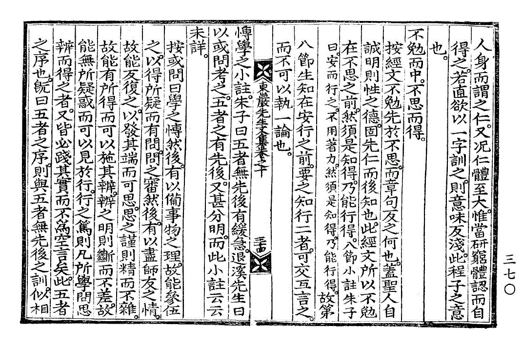 按经文不勉先于不思。而章句反之何也。盖圣人自诚明则性之德。固先仁而后知也。此经文所以不勉在不思之前。然须是知得。乃能行得。(八节小注朱子曰。安而行之。不用著力。然须是知得。乃能行得。)故第八节生知在安行之前。要之知行二者。可交互言之。而不可以执一论也。