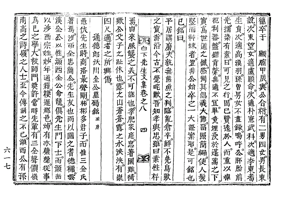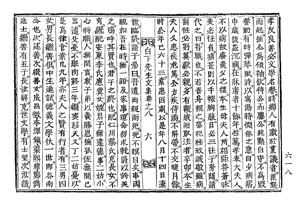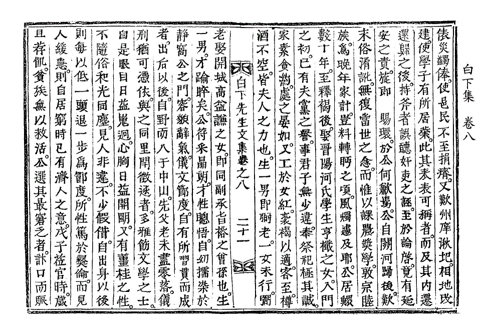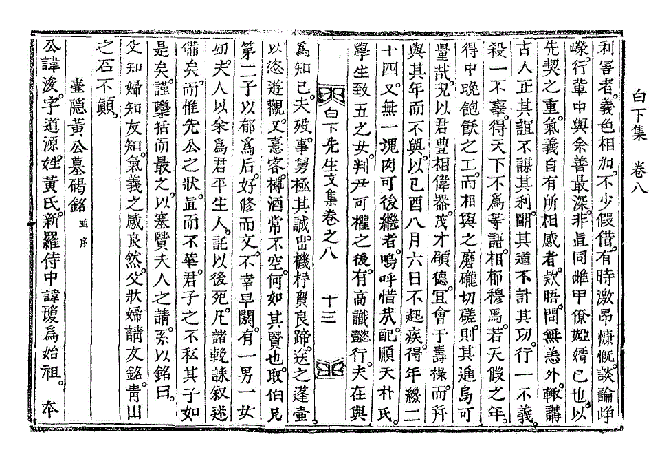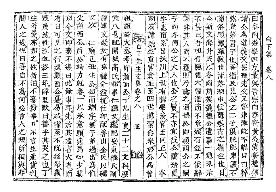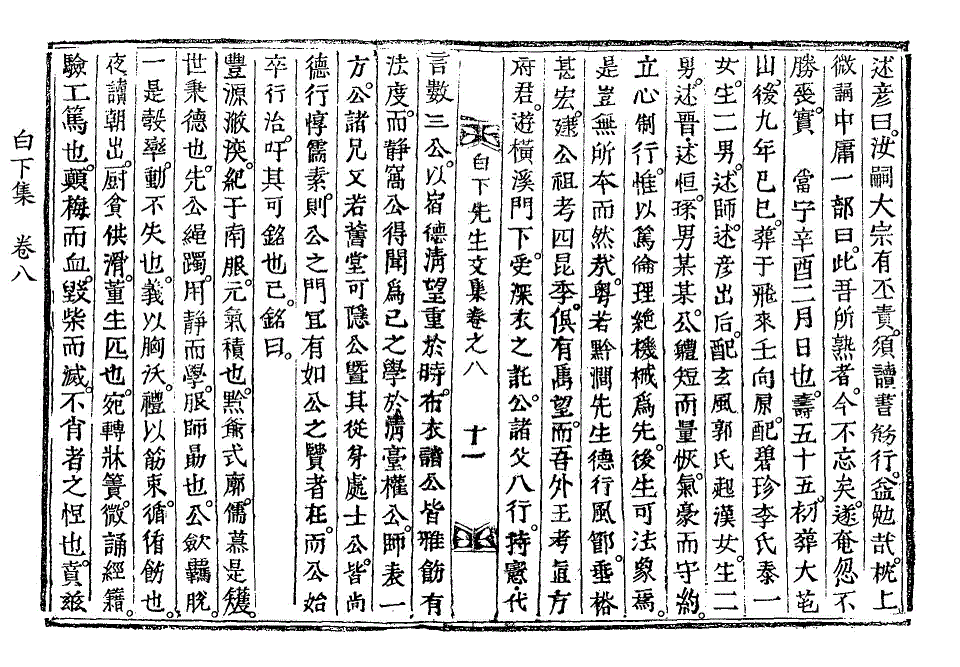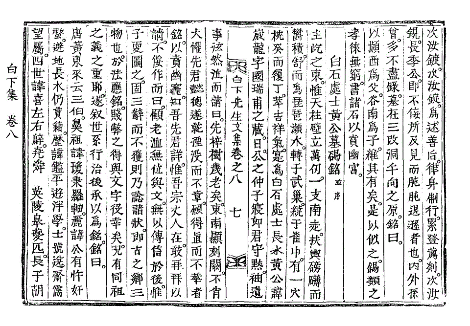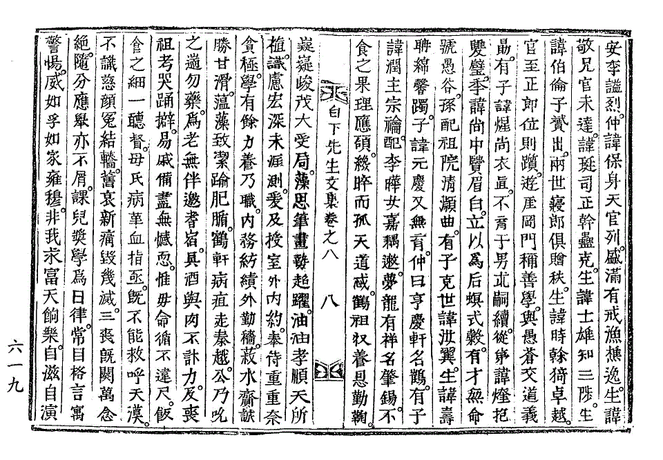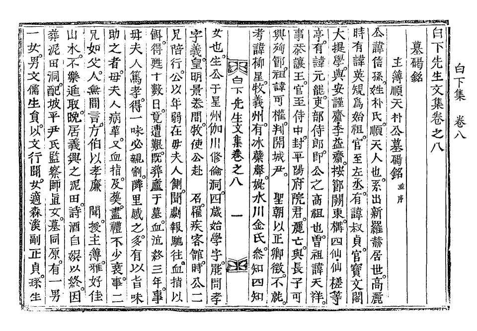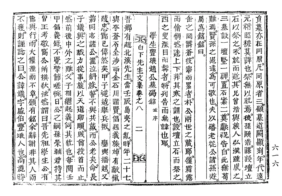洋。四最臬课。末迁台纲。虎符误噬。吏奸为伥。乍为楚囚。何罪冶长。旋即 赐环。益励佩纕。课农奖学。世念云忘。诗礼敦睦。晚计停当。一枕跨鹤。万事亡羊。白首孤存。谁与商量。刻此铭辞。庸贲幽堂。白下先生文集卷之八