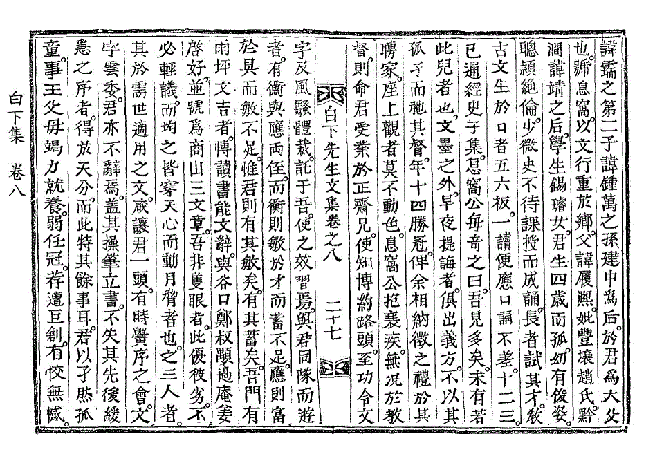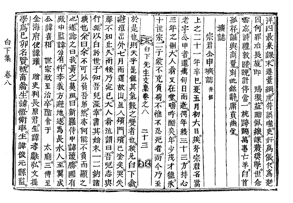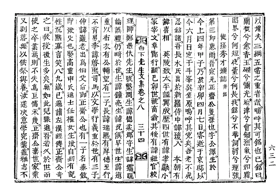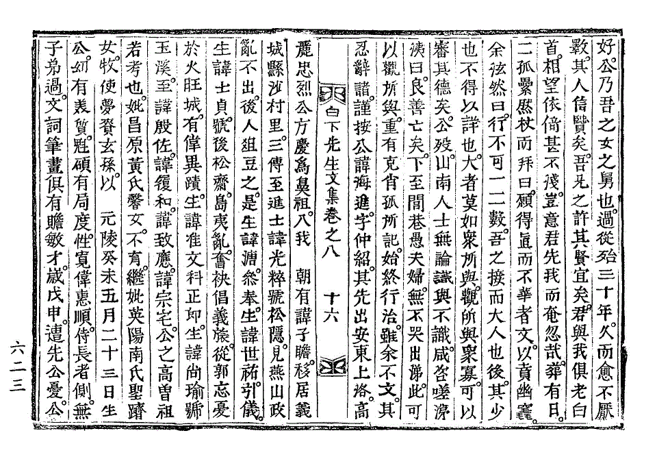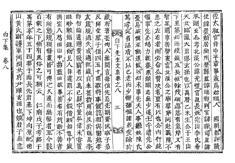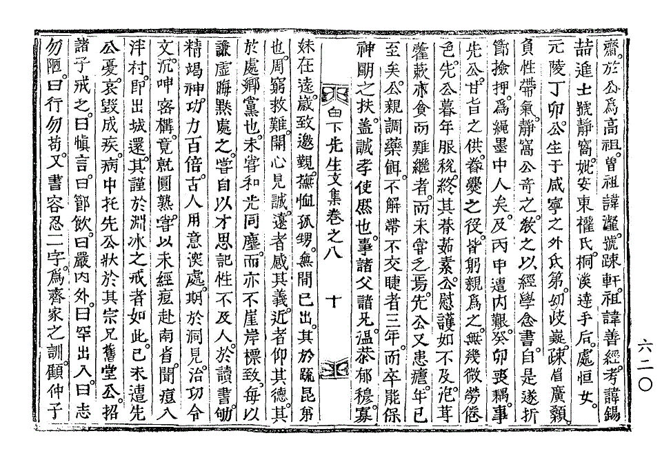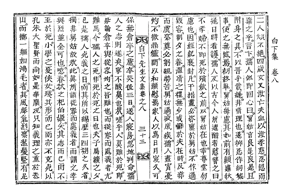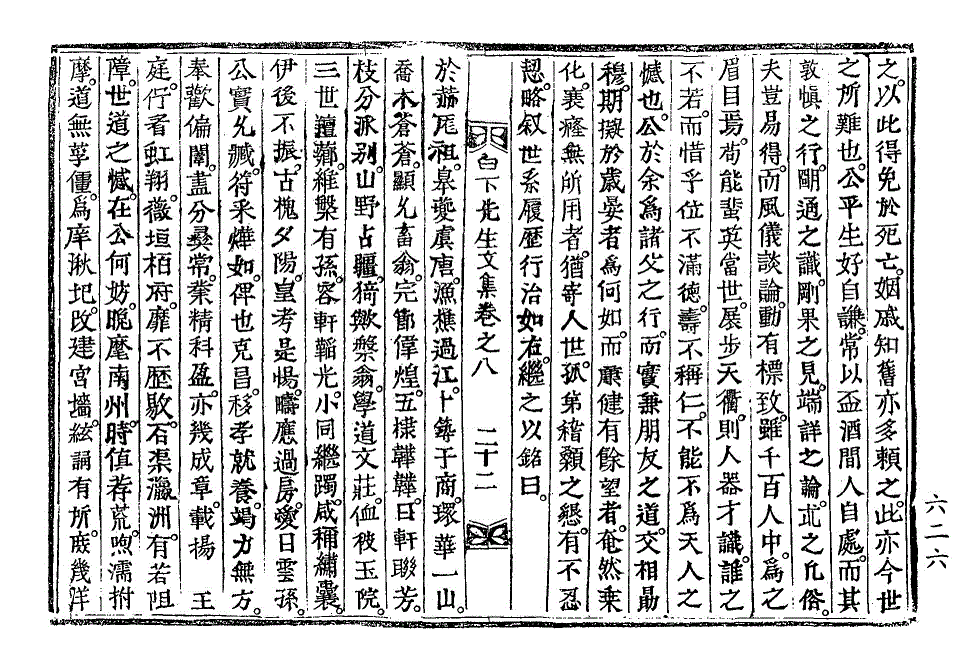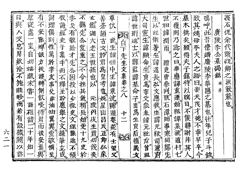 洋。四最臬课。末迁台纲。虎符误噬。吏奸为伥。乍为楚囚。何罪冶长。旋即 赐环。益励佩纕。课农奖学。世念云忘。诗礼敦睦。晚计停当。一枕跨鹤。万事亡羊。白首孤存。谁与商量。刻此铭辞。庸贲幽堂。白下先生文集卷之八