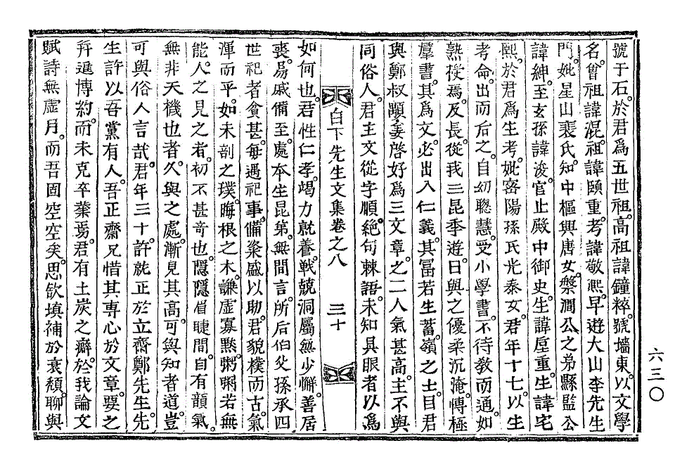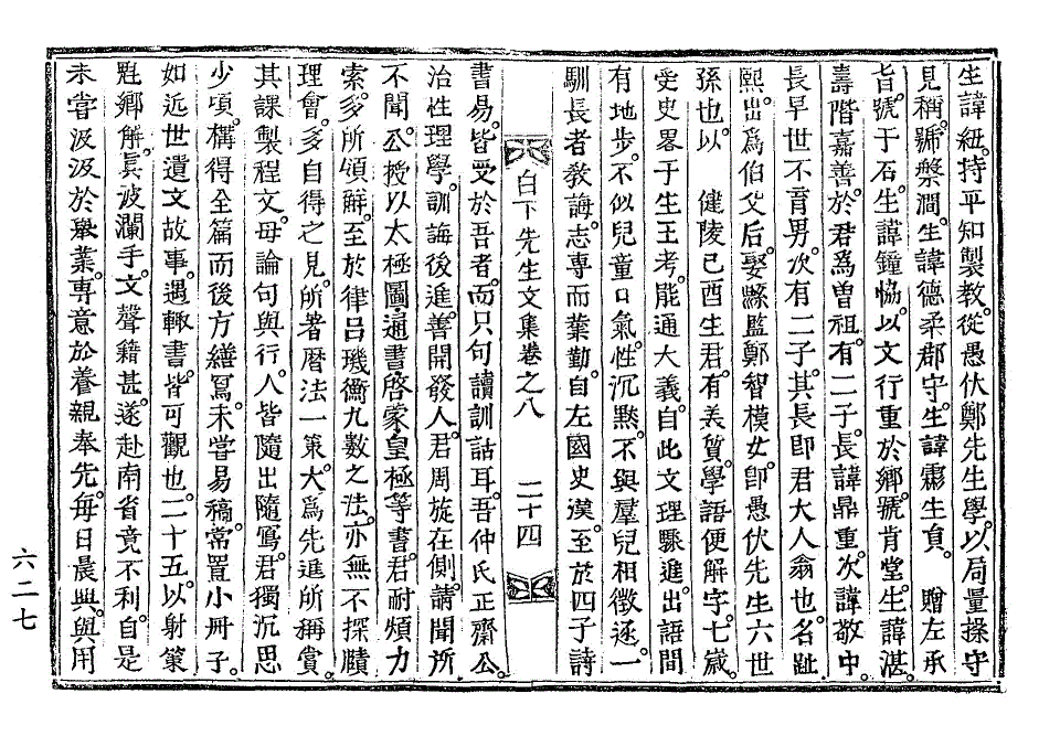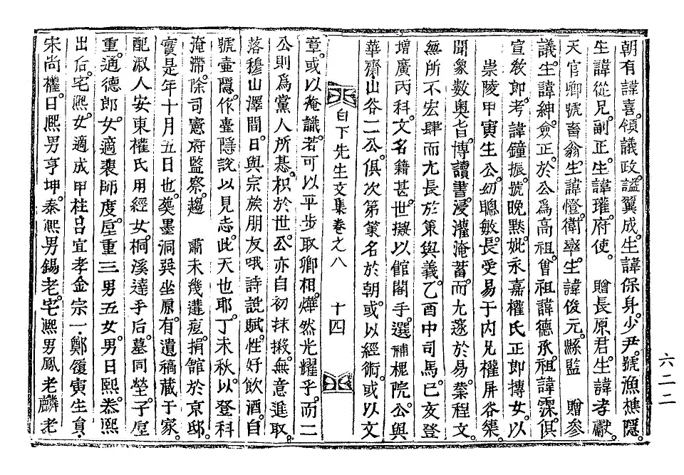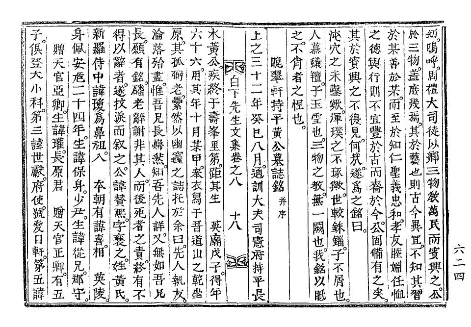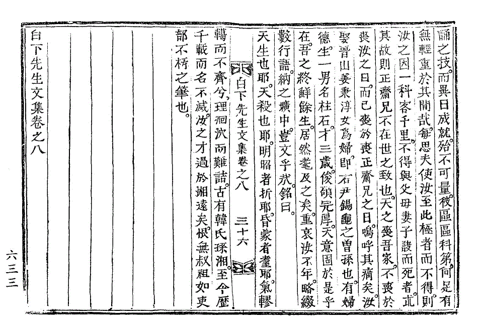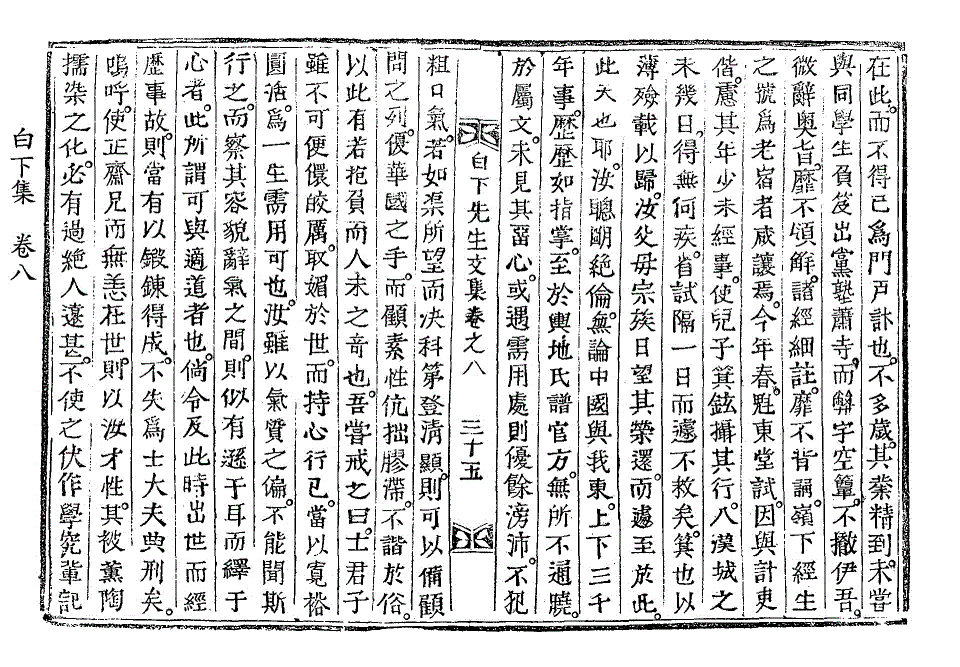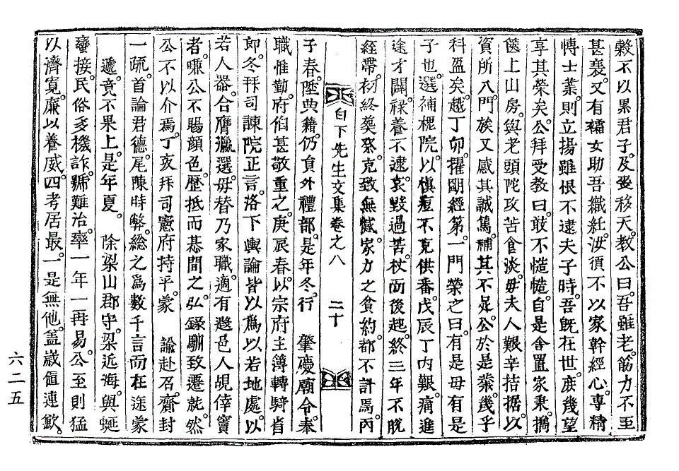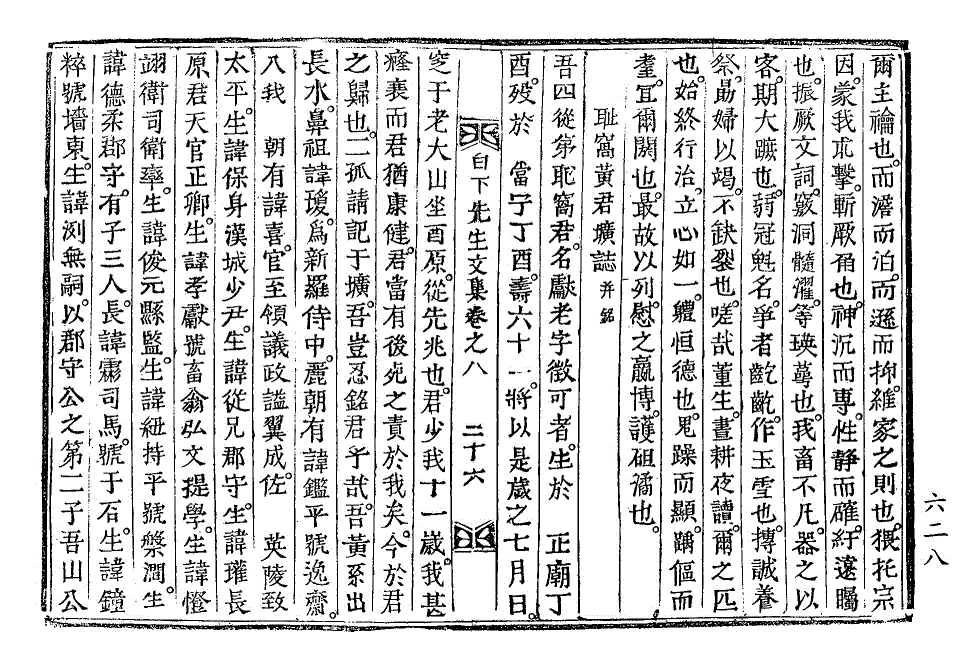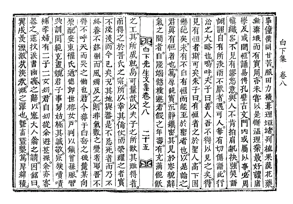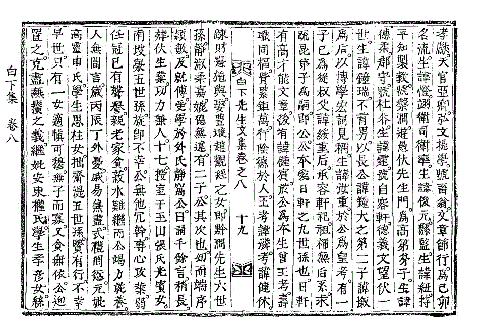 洋。四最臬课。末迁台纲。虎符误噬。吏奸为伥。乍为楚囚。何罪冶长。旋即 赐环。益励佩纕。课农奖学。世念云忘。诗礼敦睦。晚计停当。一枕跨鹤。万事亡羊。白首孤存。谁与商量。刻此铭辞。庸贲幽堂。白下先生文集卷之八