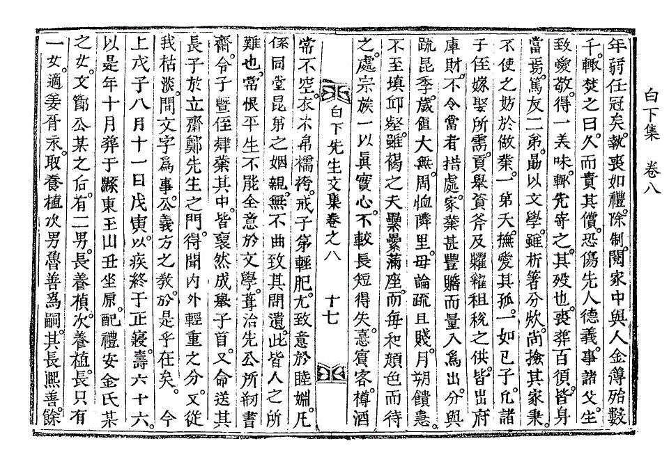 年弱任冠矣。执丧如礼。除制。阅家中与人金簿殆数千。辄焚之曰。久而责其偿。恐伤先人德义。事诸父。生致爱敬。得一美味。辄先寄之。其殁也。丧葬百须。皆身当焉。笃友二弟。勖以文学。虽析箸分炊。尚捡其家秉。不使之妨于做业。一弟夭。抚爱其孤。一如己子。凡诸子侄嫁娶所需。贡举资斧及粜籴租税之供。皆出府库财。不令当者措处。家业甚丰赡而量入为出。分与疏昆季。岁值大无。周恤邻里。毋论疏且贱。月朔馈急。不至填丘壑。虽褐之夫累累满座。而每和颜色而待之。处宗族一以真实心。不较长短得失。憙宾客。樽酒常不空。衣不帛襦裤。戒子弟轻肥。尤致意于睦姻。凡系同堂昆弟之姻亲。无不曲致其问遗。此皆人之所难也。常恨平生不能全意于文学。葺治先公所刱书斋。令子暨侄肄业其中。皆裒然成举子首。又命送其长子于立斋郑先生之门。得闻内外轻重之分。又从我枯淡。问文字为事。公义方之教。于是乎在矣。 今上戊子八月十一日戊寅。以疾终于正寝。寿六十六。以是年十月葬于县东玉山丑坐原。配礼安金氏某之女。文节公某之后。有二男。长养桢。次养植。长只有一女。适姜胥永。取养植次男鲁善为嗣。其长熙善。馀白下先生文集卷之八 第 624L 页