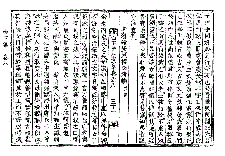 安季谥烈。仲讳保身天官列。盛满有戒渔樵逸。生讳敬兄官未达。讳珽司正干蛊克。生讳士雄知三陟。生讳伯伦子赟出。两世寝郎俱赠秩。生讳时干猗卓越。官至正郎位则踬。游厓冈门称善学。与愚苍交道义勖。有子讳煋尚衣直。不育于男求嗣续。从弟讳煃抱双璧。季讳尚中贤眉白。立以为后螟式谷。有才无命号愚谷。孙配祖院清𤃡曲。有子克世讳汝翼。生讳寿聃绵馨躅。子讳元庆又无育。仲曰亨庆轩名鹤。有子讳润主宗礿。配李晔女嘉耦遫。梦龙有祥名肇锡。不食之果理应硕。才晬而孤天道忒。鹤祖收养恩勤鞠。嶷嶷峻茂大受局。藻思笔画势超跃。油油孝顺天所植。识虑宏深未涯测。爰及授室外内约。奉侍重重奈贫极。学有馀力养乃职。内务纺绩外勤穑。菽水赍诚胜甘滑。蕴藻致洁踰肥腯。鹤轩病疽走秦越。公乃吮之遄勿药。为老无伴邀耆宿。具酒与肉不计力。及丧祖考哭踊擗。易戚备尽无憾恧。惟母命循不违尺。饭食之细一听督。母氏病革血指亟。既不能救呼天漠。不议慈颜冤结轖。旧哀新痛毁几灭。三丧既阕万念绝。随分应举亦不屑。课儿奖学为日律。常目格言寓警惕。威如孚如家雍穆。非我求富天饷乐。自滋自演白下先生文集卷之八 第 620H 页