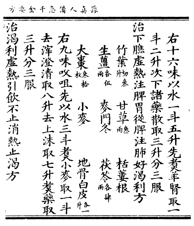 萎蕤 知母(各四/两) 生地黄(六/两)小麦(二/升) 大枣(二十/枚) 淡竹叶(切三/升)