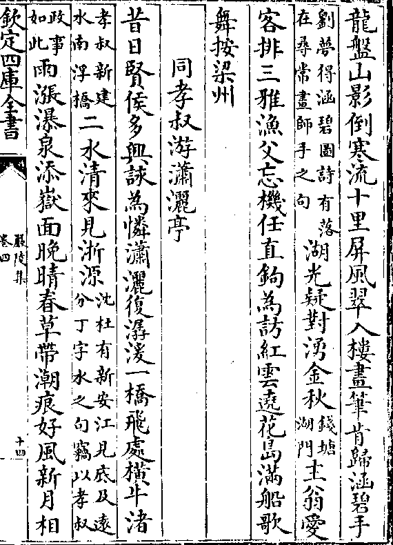 龙盘山影倒寒流十里屏风翠入楼画笔肯归涵碧手(刘梦得涵碧图诗有落/在寻常画师手之句)湖光疑对涌金秋(钱塘/湖门)主翁爱