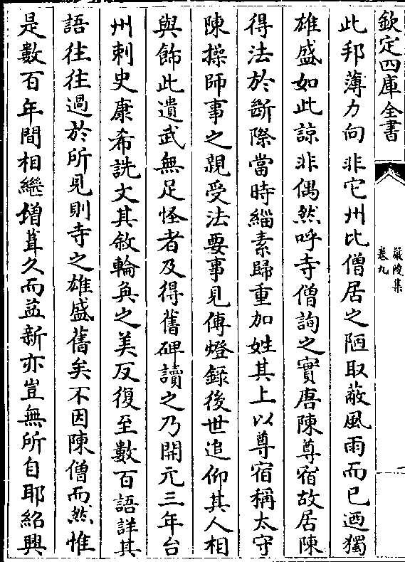 此邦薄力向非它州比僧居之陋取蔽风雨而已乃独雄盛如此谅非偶然呼寺僧询之实唐陈尊宿故居陈