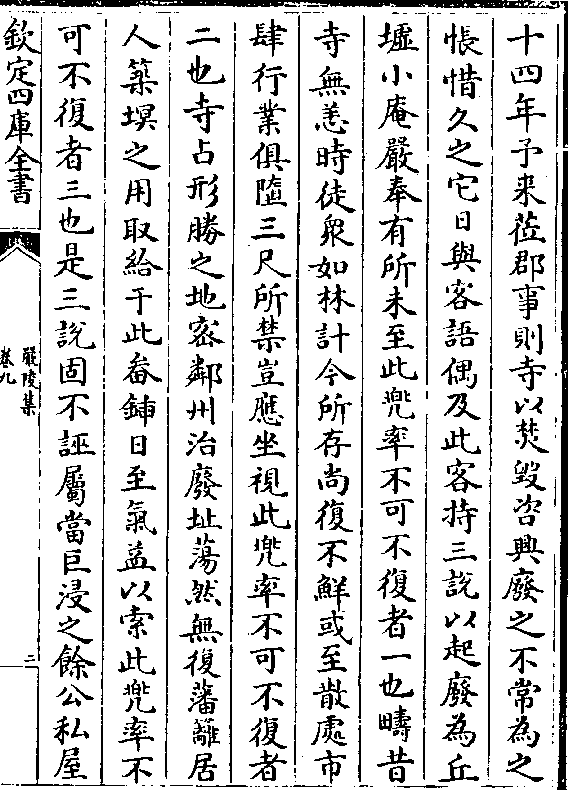 十四年予来莅郡事则寺以焚毁咨兴废之不常为之怅惜久之它日与客语偶及此客持三说以起废为丘
