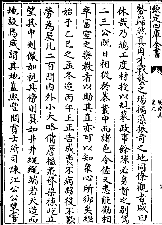 势岿然真角才战艺之场摛藻振奇之地同僚观者咸曰休哉乃鸠工度材授以规摹政事馀隙必身督之别驾