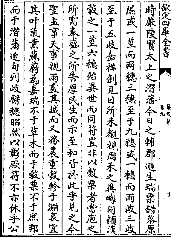 时严陵实太上之潜藩今日之辅郡乃生瑞粟错落原隰或一茎而两穗三穗至于九穗或一穗而两歧三歧