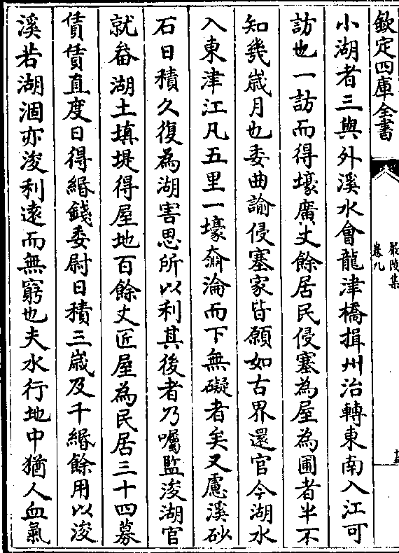 小湖者三与外溪水会龙津桥揖州治转东南入江可访也一访而得壕广丈馀居民侵塞为屋为圃者半不