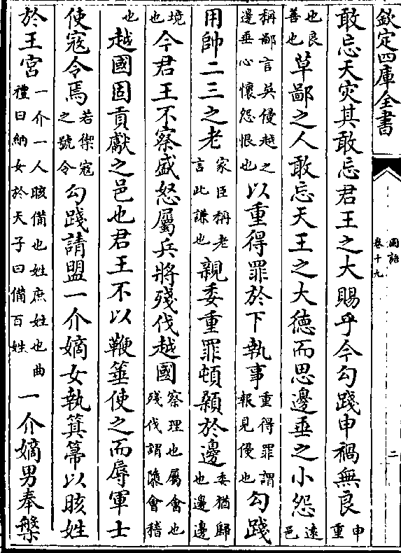 敢忘天灾其敢忘君王之大赐乎今勾践申祸无良(申/重)(也良/善也)草鄙之人敢忘天王之大德而思边垂之小怨(远/邑)