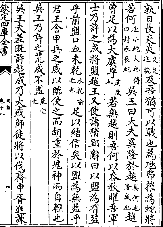 孰日长炎炎(炎炎/进貌)及吾犹可以战也为虺弗摧为蛇将若何(虺小蛇大也传/曰封豕长蛇)吴王曰大夫奚隆于越(奚何也/隆盛也)越