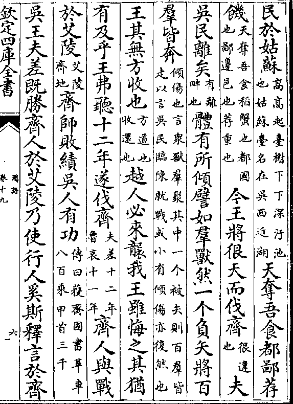 民于姑苏(高高起台榭下下深污池/也姑苏台名在吴西近湖)天夺吾食都鄙荐饥(天夺吾食稻蟹也都国/也鄙边邑也荐重也)今王将很天而伐齐(很违/也)夫