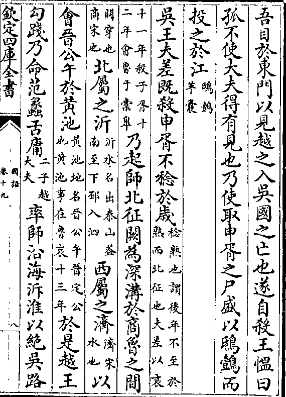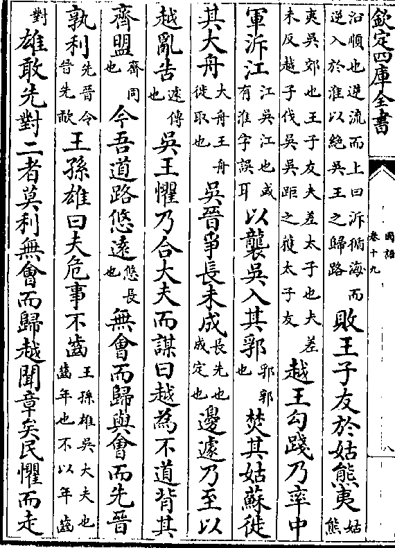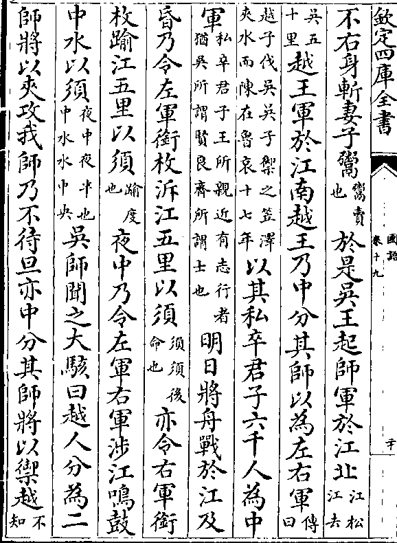 不右身斩妻子鬻(鬻卖/也)于是吴王起师军于江北(江松/江去)(吴五/十里)越王军于江南越王乃中分其师以为左右军(傅/曰)