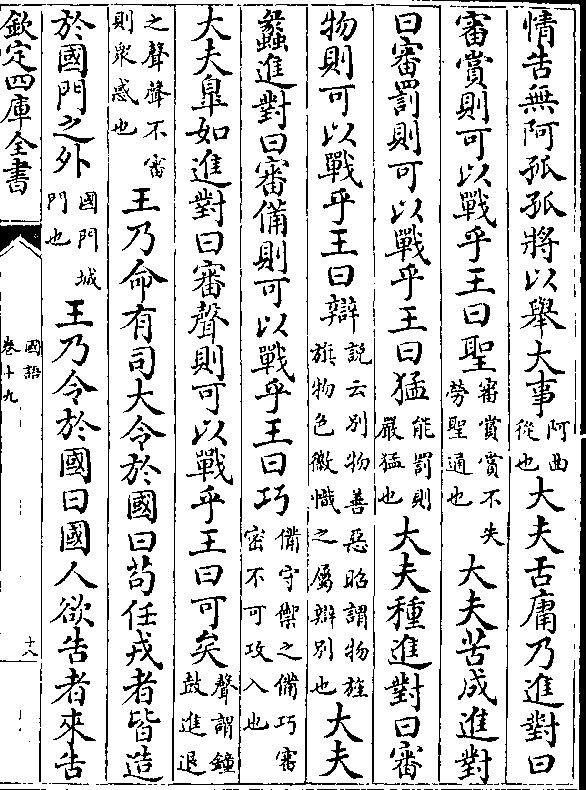 情告无阿孤孤将以举大事(阿曲/从也)大夫舌庸乃进对审赏则可以战乎王曰圣(审赏赏不失/劳圣通也)大夫苦成进对
