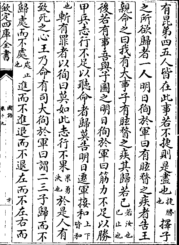 有昆弟四五人皆在此事若不捷则是尽也(捷胜/也)择子之所欲归者一人明日徇于军曰有眩瞀之疾者告王