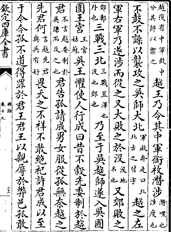 (越复有中军故中/分其师以御之)越王乃令其中军衔枚潜涉(潜嘿也/涉度也)不鼓不噪以袭攻之吴师大北(军败奔走曰北/北古之背字)越之左