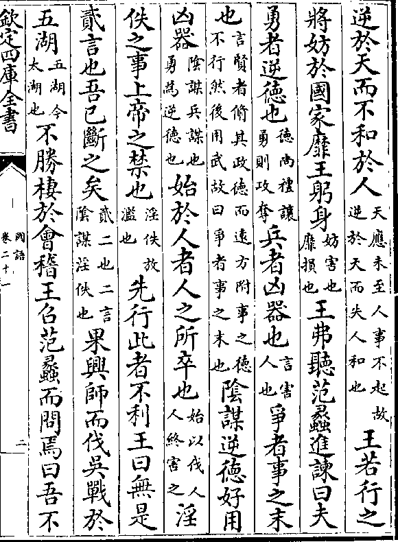 逆于天而不和于人(天应未至人事不起故/逆于天而失人和也)王若行之将妨于国家靡王躬身(妨害也/靡损也)王弗听范蠡进谏曰夫