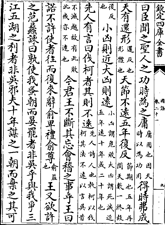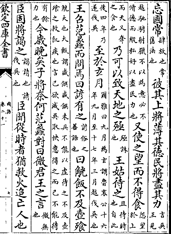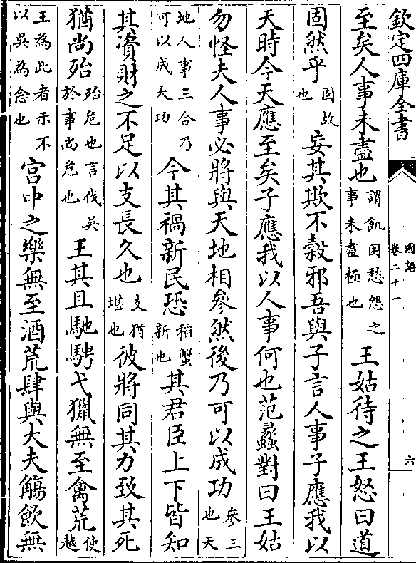 下之成利(恒常也/制度也)事无间时无反(吴事无衅隙/天时未在越)则抚民保教以须之(保守/也)王曰不谷之国家蠡之国家也蠡其