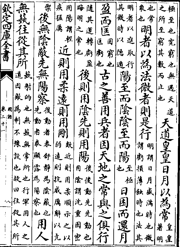 (极至也究穷也无过天道/之所至穷其数而止也)天道皇皇日月以为常(皇皇/著明)(也常/象也)明者以为法微者则是行(明谓日月盛满时也微/谓亏损薄蚀时也法其)