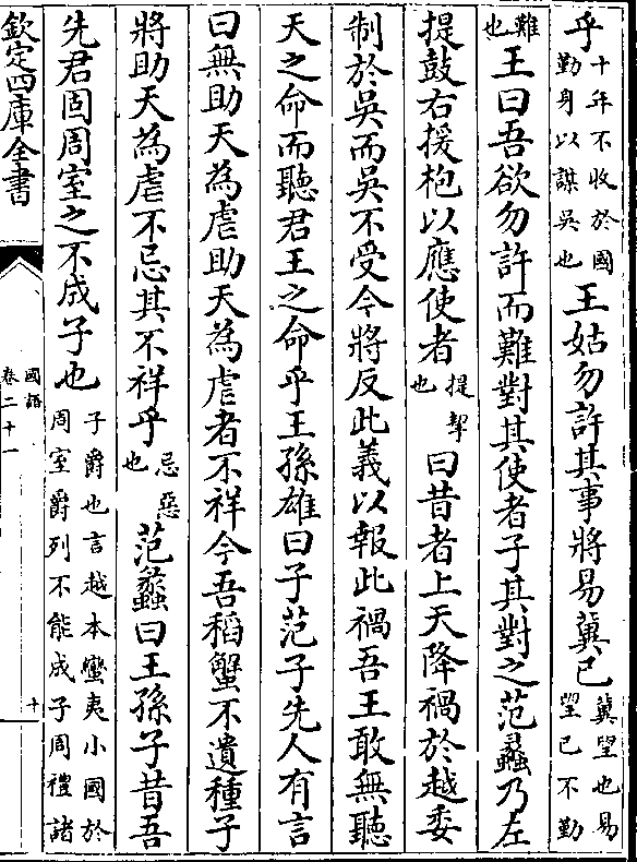 乎(十年不收于国/勤身以谋吴也)王姑勿许其事将易冀已(冀望也易/望已不勤)(难/也)王曰吾欲勿许而难对其使者子其对之范蠡乃左