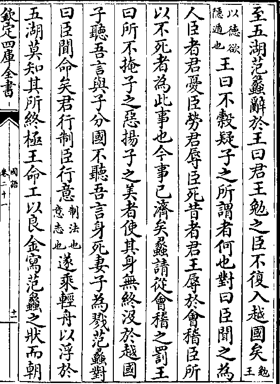 至五湖范蠡辞于王曰君王勉之臣不复入越国矣(勉/王)(以德欲/隐遁也)王曰不谷疑子之所谓者何也对曰臣闻之为