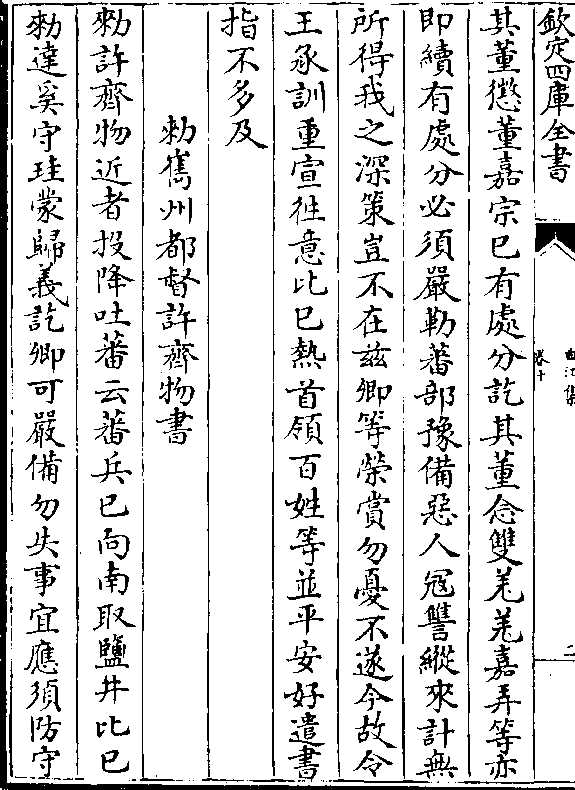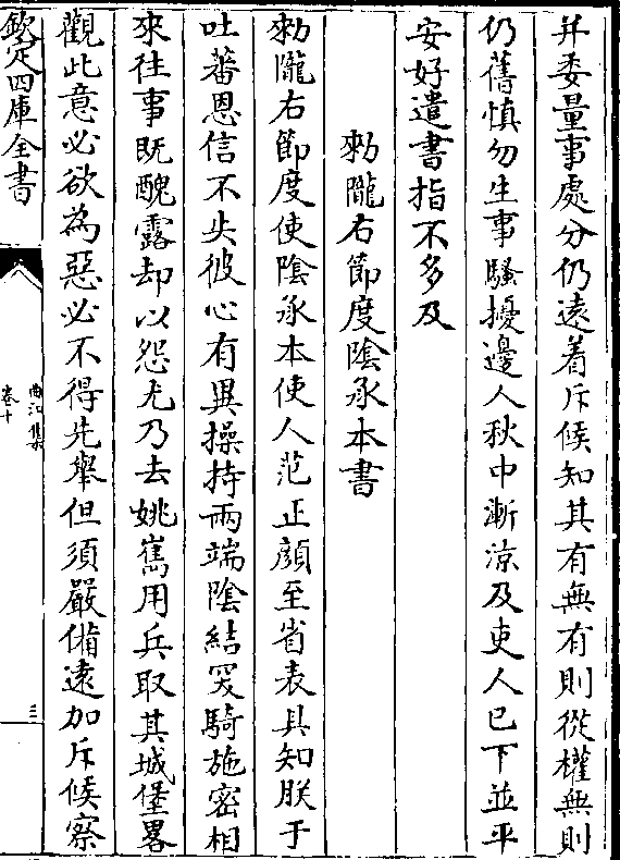 并委量事处分仍远着斥候知其有无有则从权无则仍旧慎勿生事骚扰边人秋中渐凉及吏人
